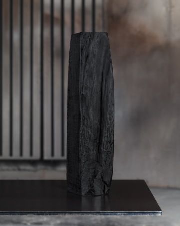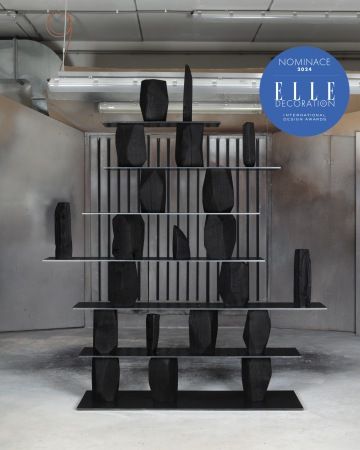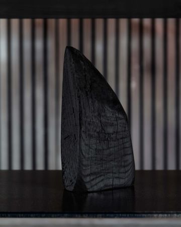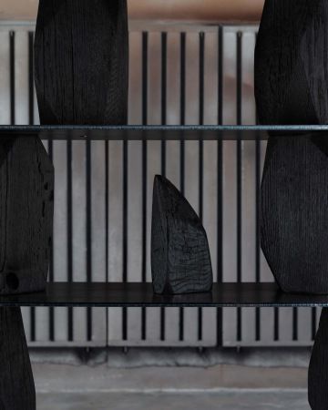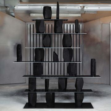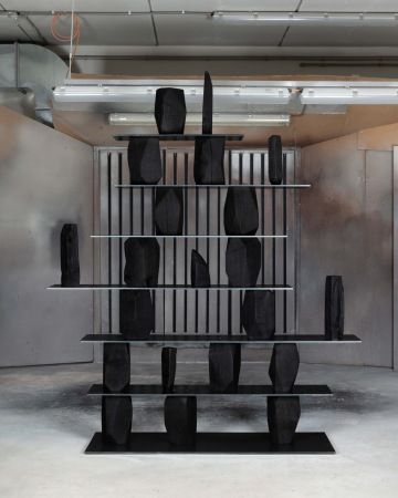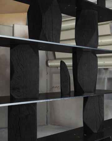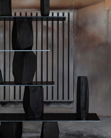 Spálené dřevěné objekty tzv. kameny podpírají zcela exaktní tenké kovové police. Porézní a jasně nedefinované masivní kameny jsou tak protiváhou hladkého a chladného železa. Materiály se ale ve své surové podobě podpoří a výsledný objekt působí velmi kompaktně.