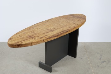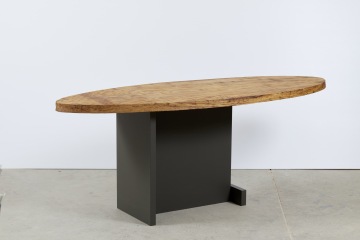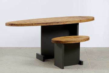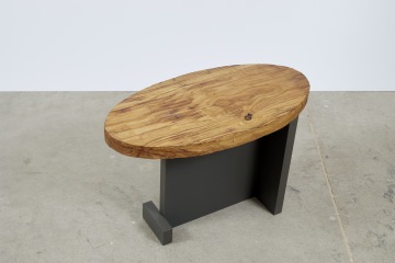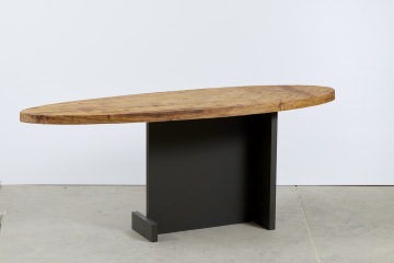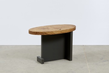 Stoly jsou tvořeny velmi organickou stolovou deskou z dubového masivu. Přísně geometrické podnoží podtrhuje přírodní vzhled stolové desky. Barva podnoží je jednolitá a tato barevná přísnost je taktéž protiváhou k naturální kresbě a tónům dubového masivu.